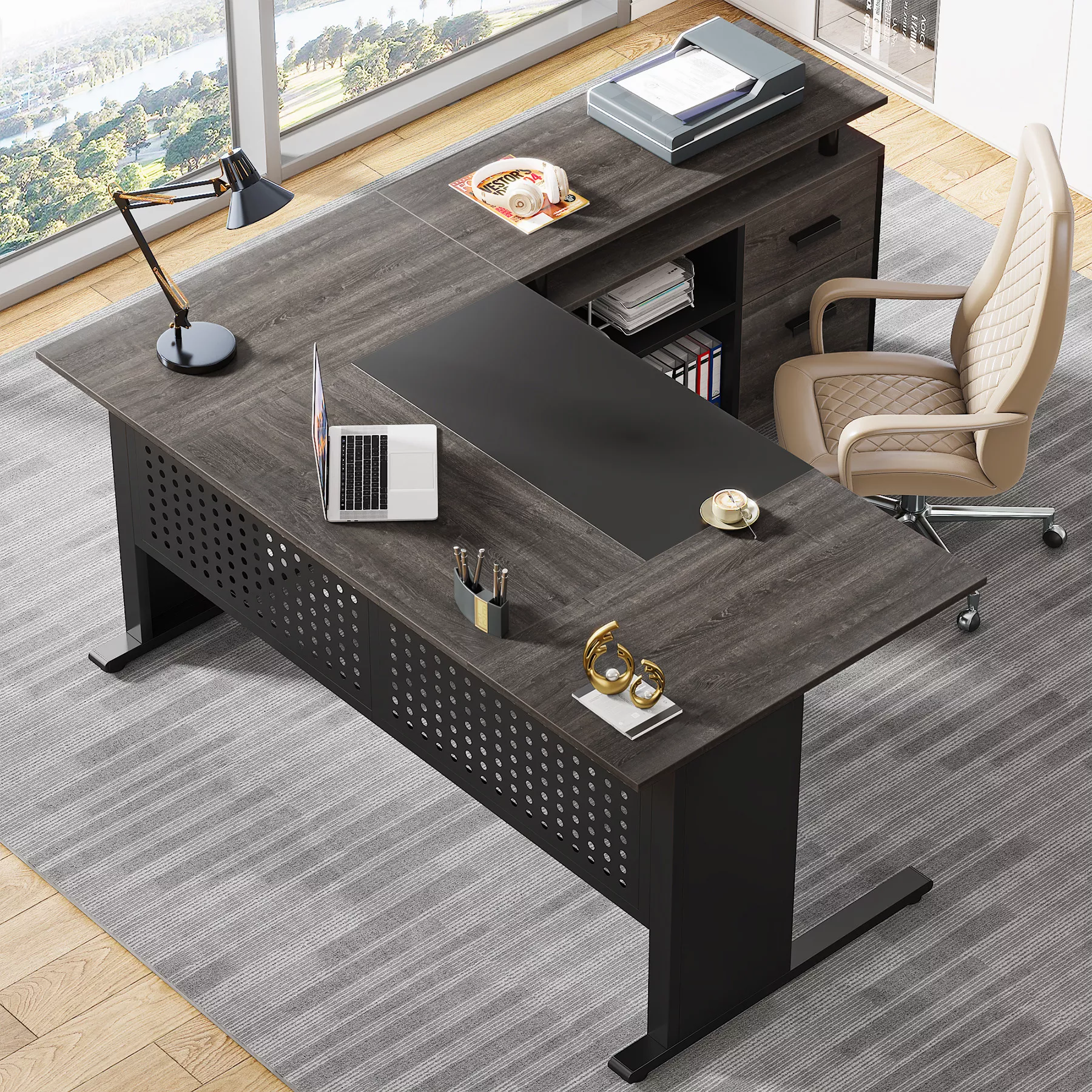 63-Inch L Shaped Executive Desk with File Cabinet and Storage