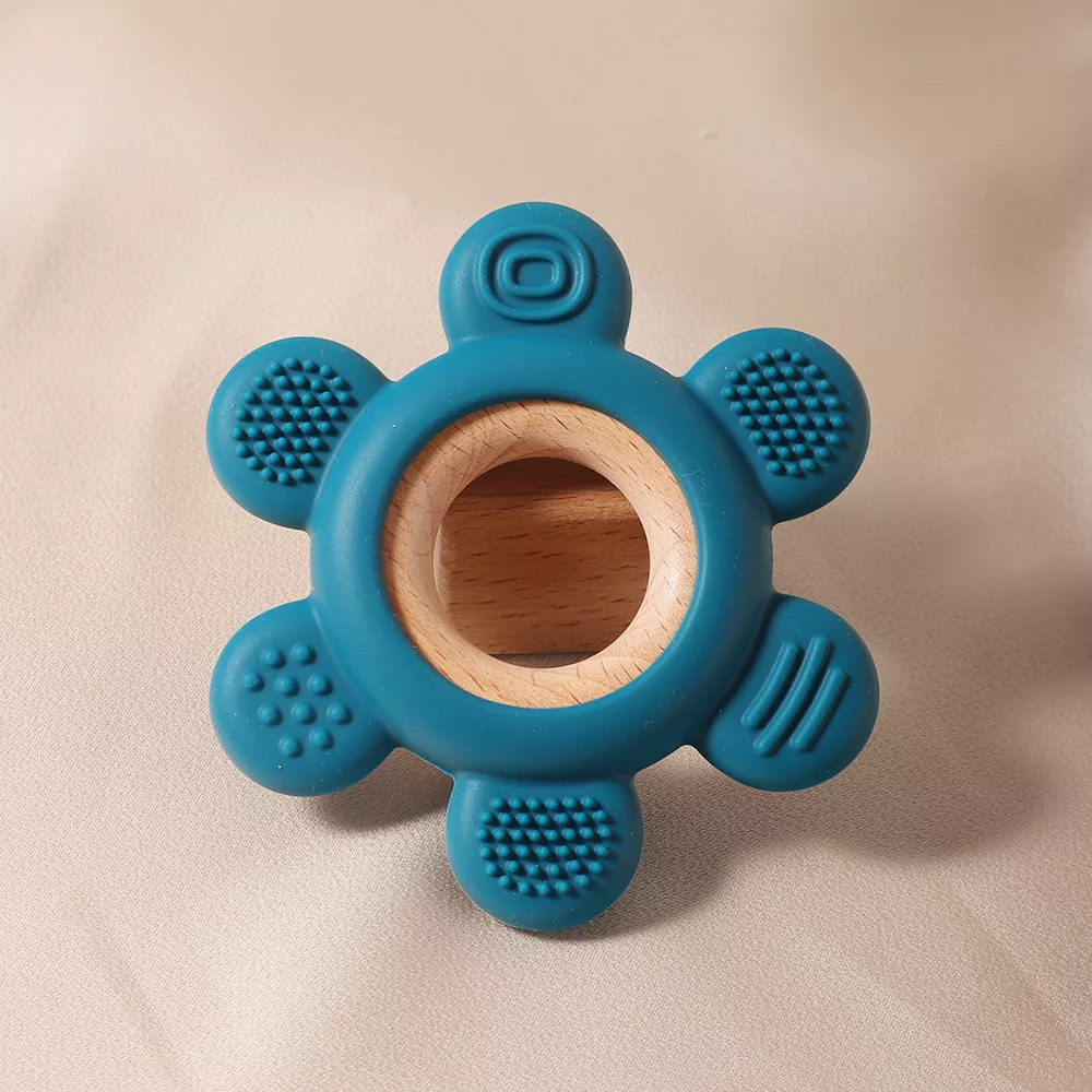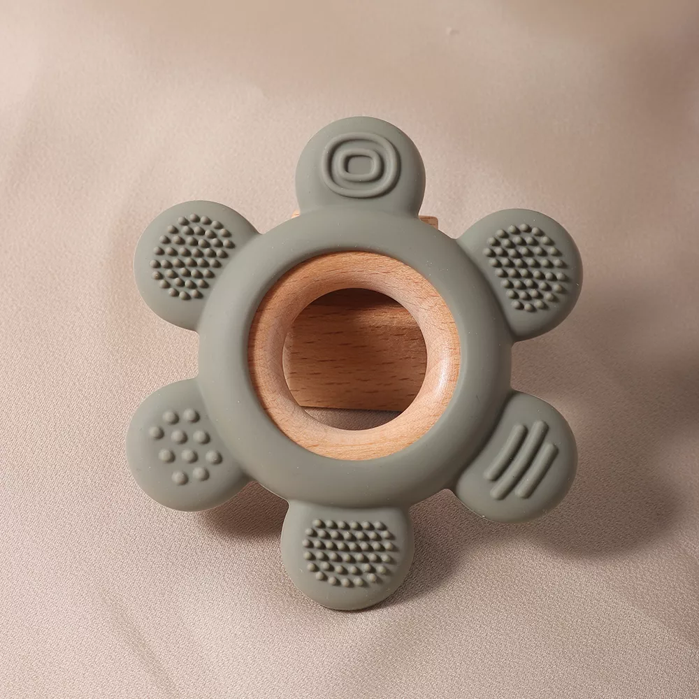 Teething can be a stressful time for both babies and parents, but with this wooden ring and silicone flower teether, you can make the experience easier and more comfortable for your little one. The soft silicone material massages your baby’s gums while offering a satisfying chew that helps alleviate discomfort. Plus, the natural wooden ring is easy for your baby to grip, which enhances motor skills development as well as providing comfort.